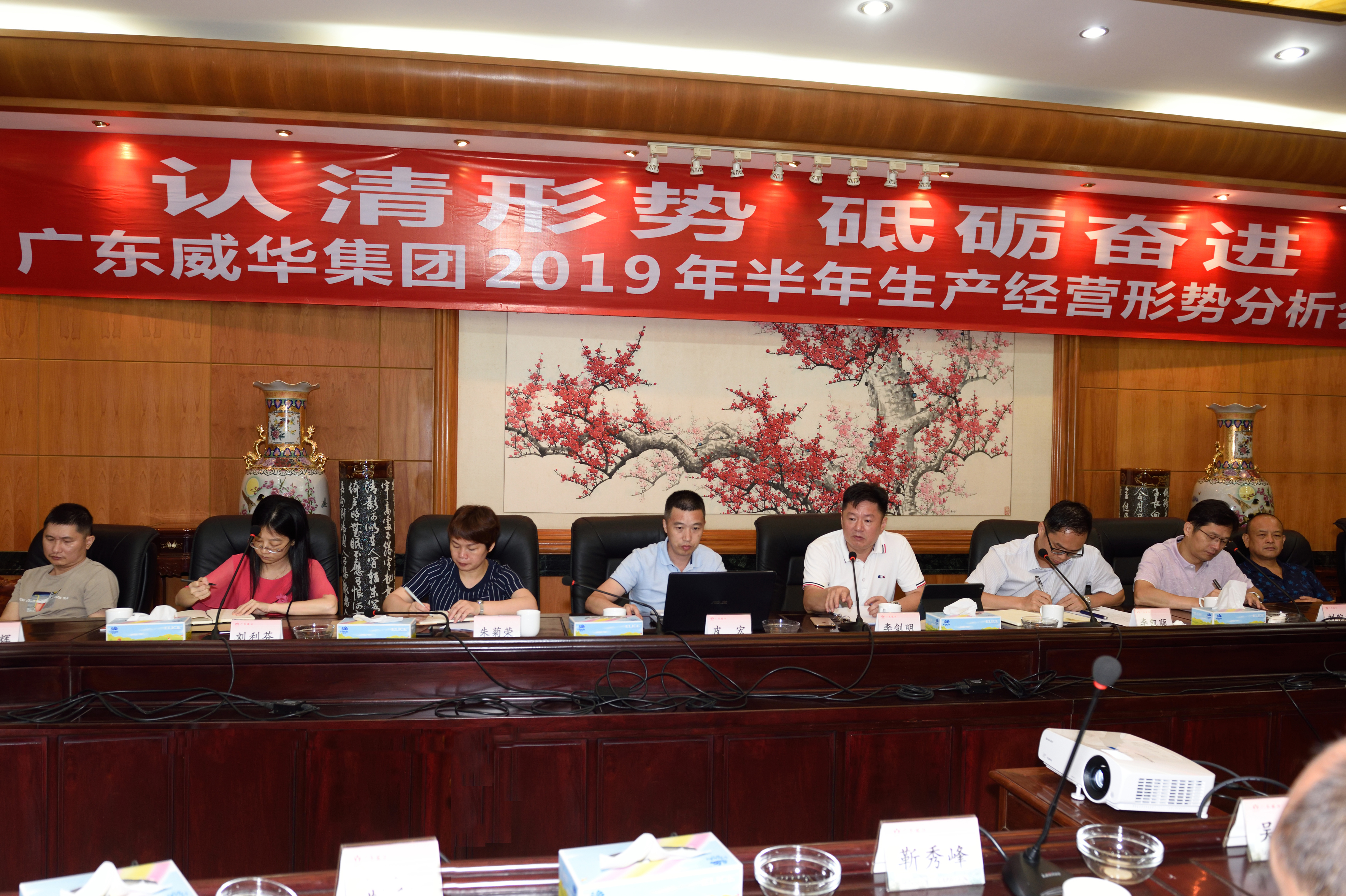 2019年7月11日,集團(tuán)公司在梅州威華園召開(kāi)2019年半年生產(chǎn)經(jīng)營(yíng)形勢(shì)分析會(huì)議,集團(tuán)公司總經(jīng)理李劍明、部門負(fù)責(zé)人以上管理干部,各下屬企業(yè)負(fù)責(zé)人等38人參加了會(huì)議,集團(tuán)公司常務(wù)副總經(jīng)理李凱順主持會(huì)議。會(huì)議聽(tīng)取和討論了威華茶博園設(shè)計(jì)方案,各企業(yè)第一負(fù)責(zé)人總結(jié)了上半年工作、匯報(bào)了下半年工作計(jì)劃和目標(biāo),分析了各自面臨的生產(chǎn)經(jīng)營(yíng)形勢(shì),并提出了應(yīng)對(duì)方案。李劍明總經(jīng)理對(duì)各企業(yè)工作情況做了點(diǎn)評(píng),對(duì)各企業(yè)上半年主動(dòng)作為,圓滿完成上半年考核目標(biāo)給予了肯定,對(duì)下半年工作提出了要求。